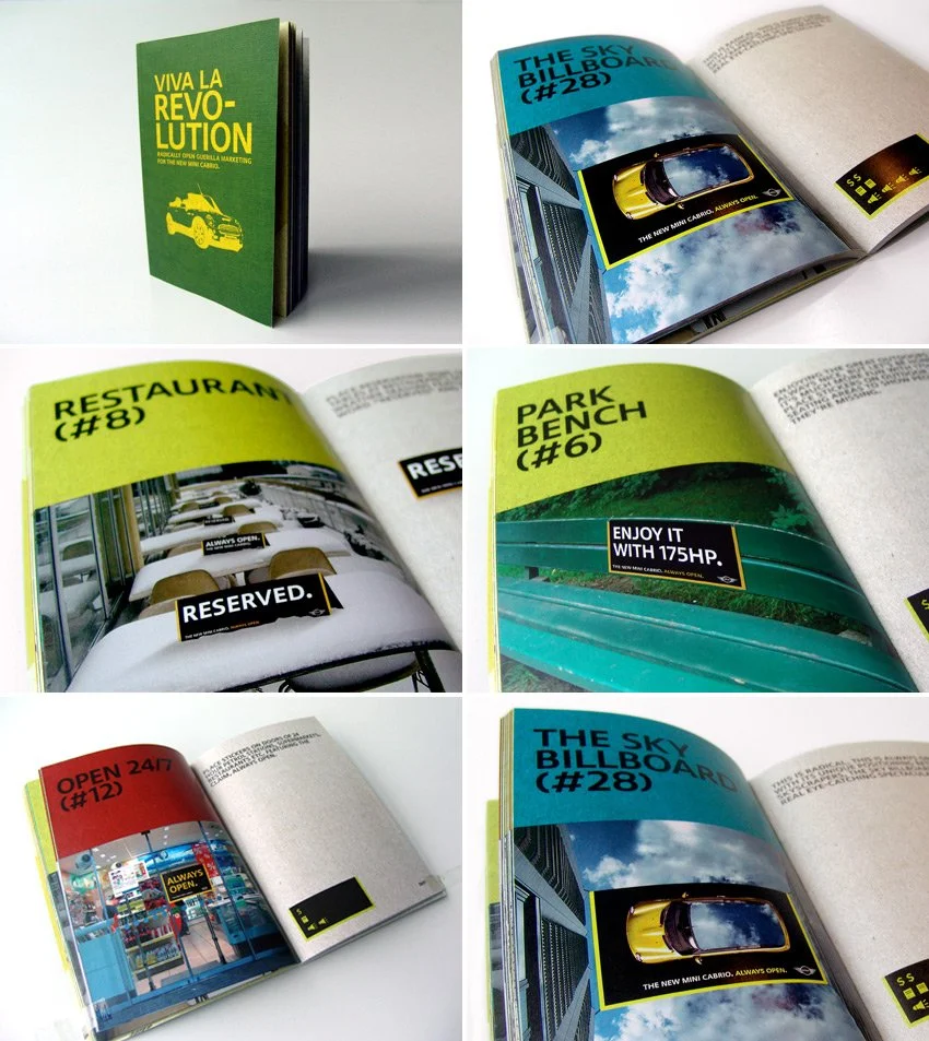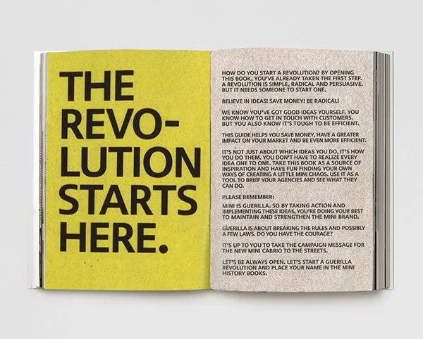 To introduce the new MINI clubman we did nothing less than starting a revolution! Take our handbook und discover countless guerilla ideas to take over your city… from graffiti templates to display ads, banners, shirts… you name it. Fight boredom. Viva la revolution!